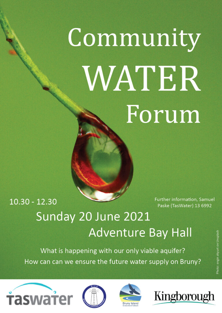 Come along to another forum on Bruny’s water supply and the impact water supply may have on the Adventure Bay aquifer. TasWater, along with BICA, BIEN and Kingborough Council are